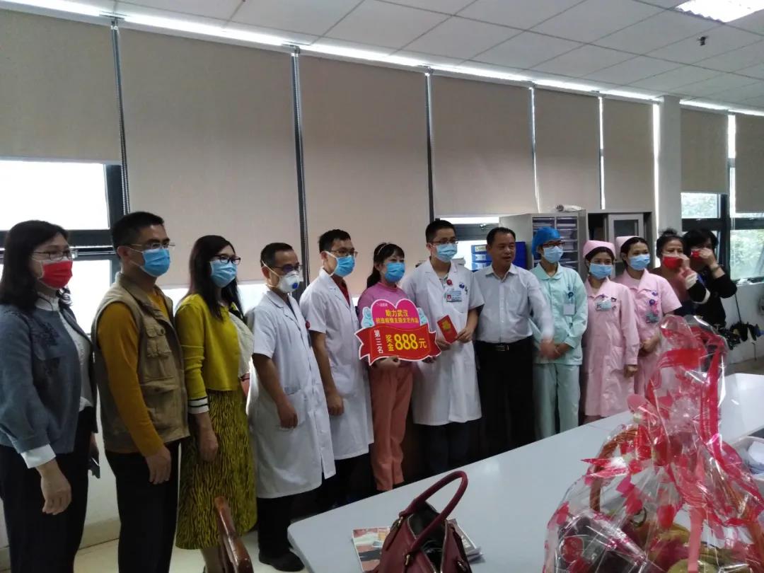 现场还进行了一次特殊的赠礼环节:市委委员林巧娜将她在阳江市海棠湾抗疫情文艺作品网投赛中获得第三名的奖金888元,全额捐赠给医疗队;将赞颂医疗队的诗联画等作品图片赠送给抗疫最美英雄们,感谢他们代表阳江市人民驰援湖北,舍小家顾大家,为家乡增添光彩。