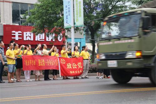 8月6日早6时,致公党员在小蓬莱广场,拉起横幅,挥舞着双手,带着满怀的热情、谢意与不舍,深情欢送支援鄂州抗洪救灾的武警8680部队。