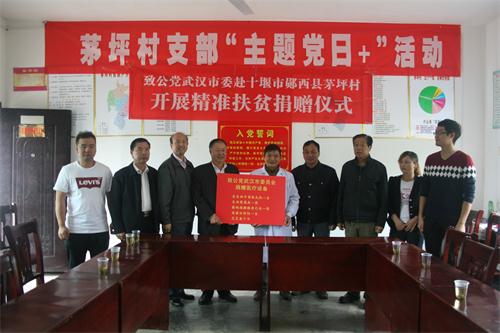 10月11日上午,致公党武汉市委会在省委会扶贫联系点十堰市郧西县土门镇茅坪村开展精准扶贫捐赠仪式。致公党武汉市委调研室负责人刘万斌、致公党湖北省委办公室主任谢军等一行5人参加了捐赠仪式。茅坪村书记赵勇、主任张娟及土门镇驻茅坪村朱书记等干部和村医马明义热情接待了大家。