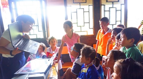 为了让苗寨的孩子们体验到不同的课堂文化,周南秀峰学校准备了两堂爱心教育课。上课地点布置在鼓楼二楼地笋村村委会办公室,一张书桌,几张板凳,构成了简易教学环境。