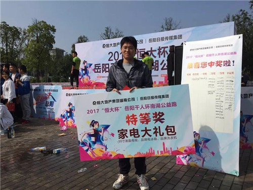 “0001056!”,在湖南省岳阳市“千人环南湖公益跑”活动最后的抽奖环节,随着主持人的语音落下,台下人群中传来一阵惊喜的喊叫。岳阳职业技术学院“致公•岳阳职院班”学生谢裕佳激动地跑上台接过奖牌,喜获特等奖万元家电大礼包。