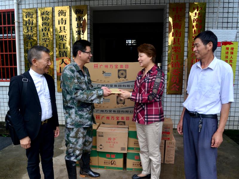 14日下午,致公党衡阳市委主委江红、副主委唐小平率领社会服务志愿者,专程冒雨赶到受灾严重的衡南县栗江镇栗江村,划着小船走进灾民家中,为27户灾民送去灾后防疫手册、防疫物资和捐款表示慰问。江红亲手将物资送到灾民的手中,并鼓励他们勇抗洪灾。