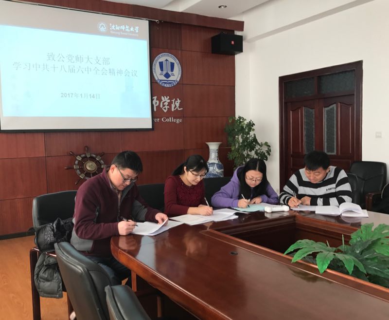 1月14日,致公党沈阳师范大学支部召开党员会议,学习了《中国共产党第十八届中央委员会第六次全体会议公报》、《关于新形势下党内政治生活的若干准则》和《中国共产党党内监督条例》等相关文件,并进行了讨论交流。