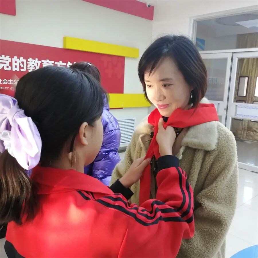 少先队员们为田亮等佩戴红领巾