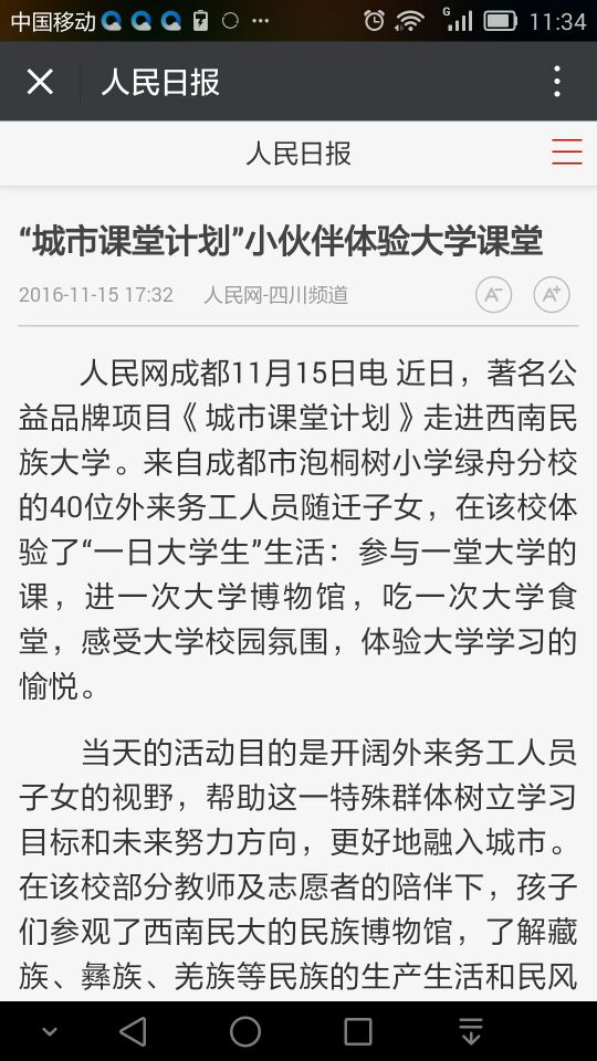 11月15日,人民网以《“城市课堂计划”小伙伴体验大学课堂》为题,报道了致公党西南民族大学支部和致公党员高善峰所在的成都云峰社会工作服务中心共同开展的公益活动。当天的《人民日报》客户端进行了专题推送。国际在线、中国网、公益中国网、中国文明网等主流网络媒体纷纷给予了报道或转载。