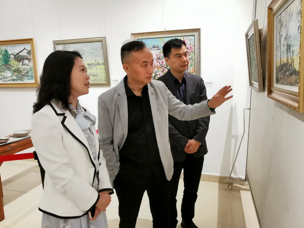 致公党员、油画家钟纲教授(中)向领导嘉宾介绍画作