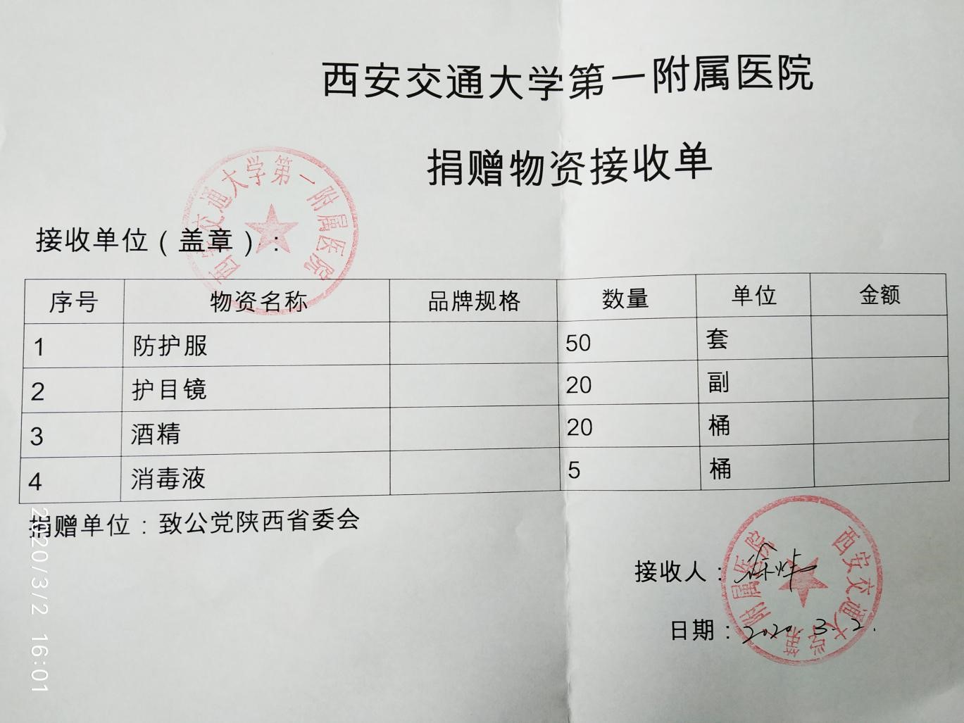 自新冠肺炎疫情防控以来,致公党陕西省委会始终坚持“筑同心、暖人心、践初心 ”,积极号召全省致公党各级组织、党员和爱心人士捐款、捐物,大家纷纷伸出援手,为抗击新冠肺炎疫情,奉献致公党人一片爱心。自2月份起,致公党西安理工大学委员会、西北大学委员会、西安交通大学总支、西北农林科技大学支部、长安大学支部、青委会等陆续捐款近4万元用于购买新冠肺炎抗疫物资。3月2日下午,致公党陕西省委会参政议政和社会服务部副部长任永胜带队一行4人,前往西安医学院第二附属医院、西安交通大学第一附属医院,捐赠防护服、护目镜、酒精、消毒液等医用物资,当这些医用物资送到交通大学第一附属医院时,医院统战部的高琰部长激动的说:“咱们致公党人真是雪中送炭,我们现在最短缺的就是这些物资啊!同时也衷心感谢致公党省委会及各级组织的爱心捐助。”