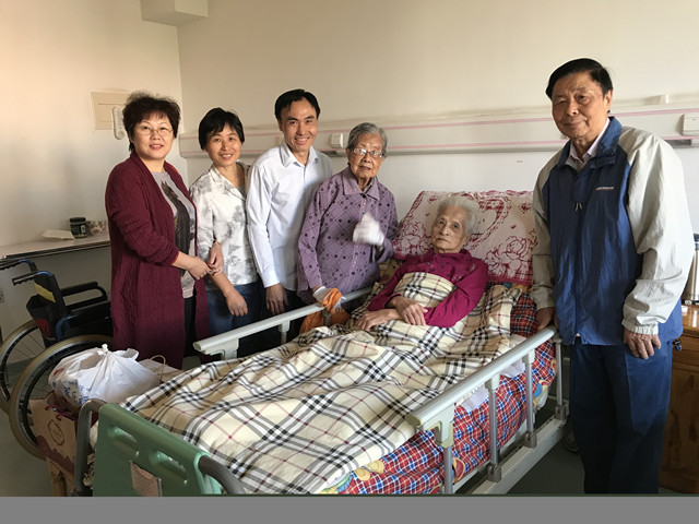 接着,她热心地带党员们一起看望另外一位老归侨吴翠蛾。吴翠蛾今年81岁,三个月前不小心摔断了腿,目前还未恢复,只能躺在养老院医院的病床上,养老院安排护理人员进行照顾。身体虚弱的吴翠蛾,目前只能吃流食。老人也是五十年代的归国华侨,经历了生活的悲欢离合,最后一个人留在了天津。大家见面都很高兴,两位老人也互致问候。