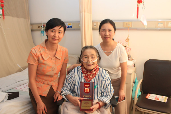 在省人民医院病房内,章月燕看望了老党员杨奇,与杨老及其子女进行交谈。90岁高龄的杨老接过纪念章,心情非常激动,回忆起当年参加革命和加入致公党的情景,一个劲地说“感谢祖国、感谢党没有忘记我们”。