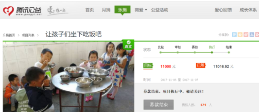 在近期,郑奋还利用了自己的社会资源,通过腾讯乐捐平台,尝试为花园小学募集一套餐桌椅。花园小学所处的彝良县每年的教育经费匮乏,用于提升生活水平的经费更加有限,为了让孩子们能够坐着吃饭,提升用餐环境,改良生活习惯。郑奋联系了昭通青年基金会认领了这个个人募捐计划,并迅速募集了11000元人民币善款,在发稿时,项目正在落地中。