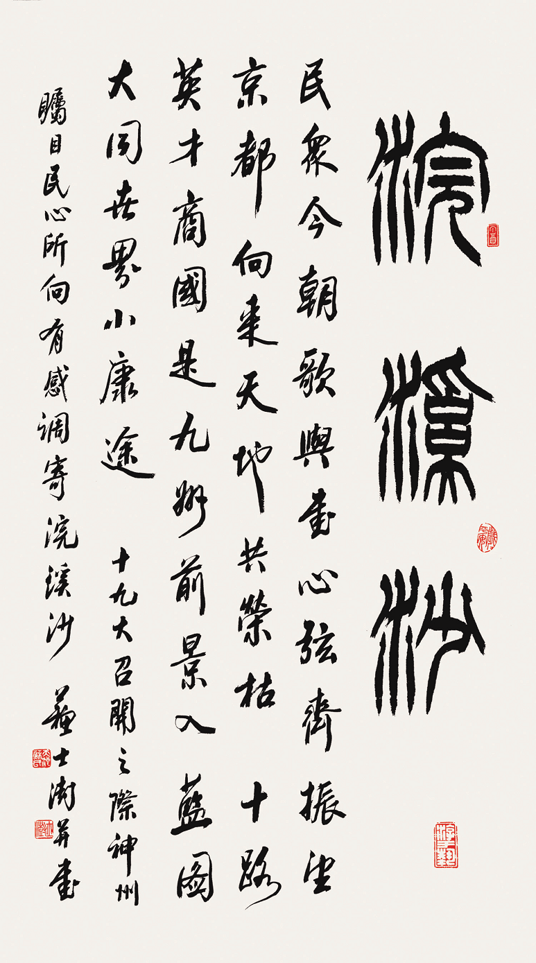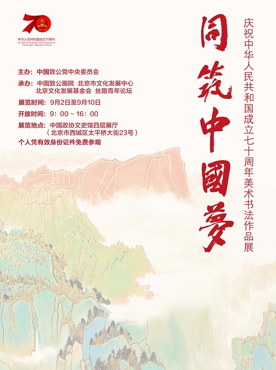 习近平总书记指出:一个时代有一个时代的文艺,一个时代有一个时代的精神。任何一个时代的经典文艺作品,都是那个时代社会生活和精神的写照, 都具有那个时代的烙印和特征。任何一个时代的文艺,只有同国家和民族紧紧维系、休戚与共,才能发出振聋发聩的声音。中国人民正在为实现中华民族伟大复兴的中国梦而不懈奋斗。同心共筑中国梦,这是全体中华儿女的共同心愿,也是全国各族人民的共同目标。今年是中华人民共和国成立70周年,也是中国共产党领导的多党合作和政治协商制度确立70周年,为引导广大致公党员不断增强“四个意识”,持续坚定“四个自信”,坚决做到“两个维护”,9月上旬致公党中央在中国政协文史馆举办了“同筑中国梦——庆祝中华人民共和国成立七十周年美术书法作品展”。此次展览共展出作品200余幅,其中邀请海内外书 画名家作品60余幅,首都艺术名家及致公党各省级组织选送作品140余幅。